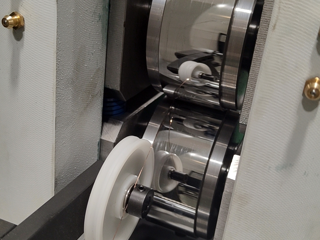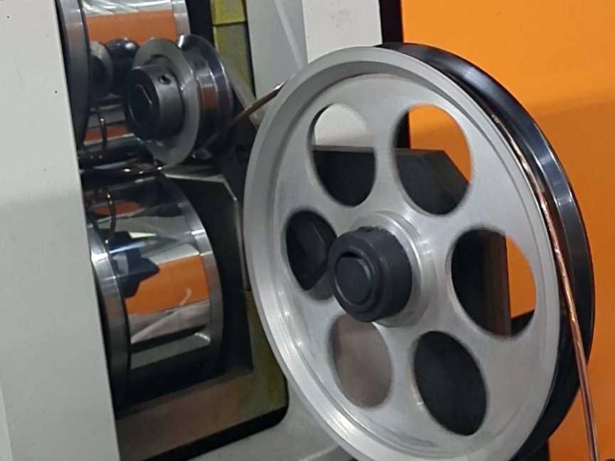 2.1、压轮轧辊机构:采用精密合金轧辊上下同步对压方式实现圆母线压扁,轧辊上下调节压扁宽度采用手动和自动相结合的方式实现精密调节压扁宽度;压扁宽度采用精密激光测径仪在线实时监测反馈给控制中心,实现在线实时纠正压扁宽度精度,确保压扁宽度尺寸精度稳定可控。
