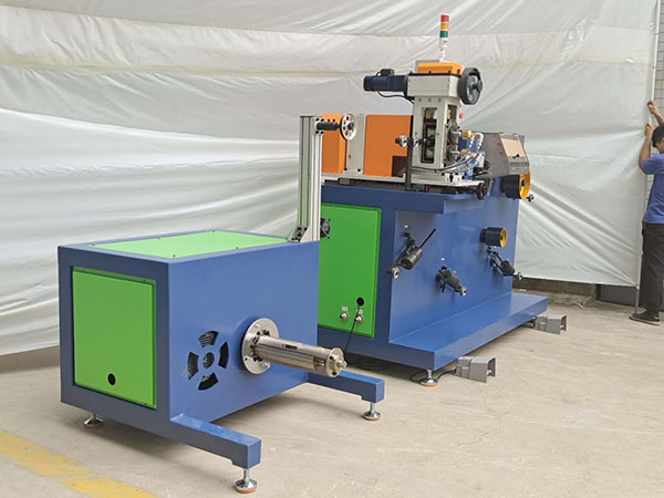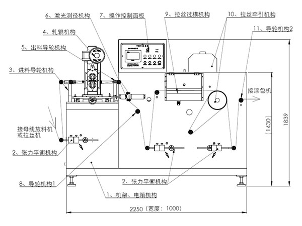 1.2、排线控制方式:为了实现扁线排列平整,采用精密丝杆加伺服电机控制结构及PLC可编程控制系统精密控制排线钢丝夹着扁线在收料空轴内侧间往返移动、空轴两端增量依据不同收料空设定补偿量后系统在收料空轴两端掉头时自动补偿增量,实现排线整齐美观。增加满盘蜂鸣器报警功能,排线规格的设置及触摸屏界面操作实现程序高集成、用户操作超简便的设计,极大简化用户操作。