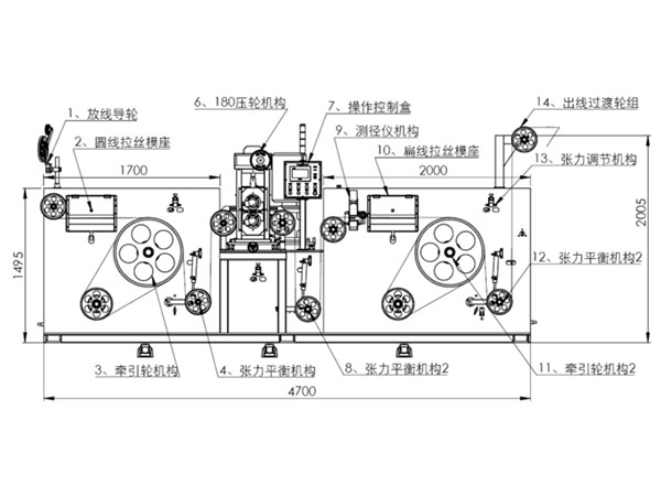 1.1、压轮轧辊机构:采用精密日本合金轧辊上下同步对压方式实现圆母线压扁,轧辊上下调节压扁宽度采用手动和自动相结合的方式实现精密调节压扁宽度;压扁宽度采用精密激光测径仪在线实时监测反馈给控制中心,实现在线实时纠正压扁宽度精度,确保压扁宽度尺寸精度稳定可控。