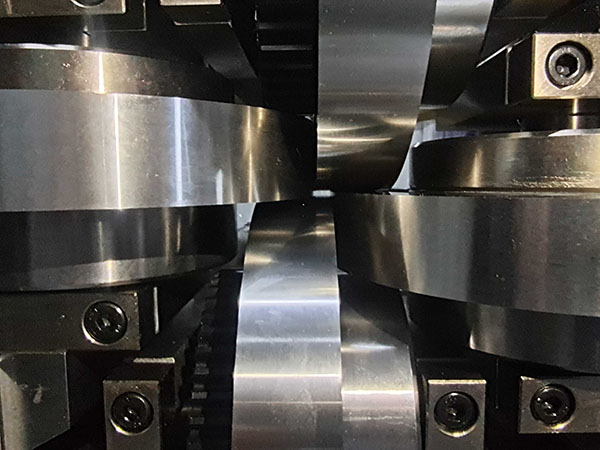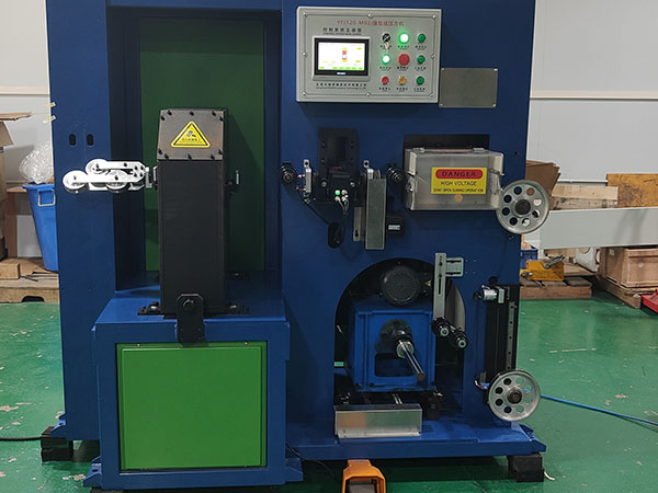 2.2、四方压延机2:采用4轮电动可调结构设计,在触摸屏上设定扁线宽度和厚度参数后,伺服自动调整四方压延机的规格尺寸,压轮的0位具有预防压坏功能;定形四方压延机压轮为钢轮,出口端设有测量扁线尺寸的测宽度和厚度的激光测径仪;测径仪的宽度和后厚度比例根据产品尺寸规格、母线的股数、直径、包膜厚度、包膜层数、测量当前值等参数进行自动进行尺寸微调处理,处理条件有宽度优先和厚度优先满足的条件选择模式,宽度公差、厚度公差同时兼顾的智能调控模式最大条件确保扁线尺寸和截面结构稀松比率管控,确保因参数调试不当导致断股现象、损坏漆包线外皮的品质管控方法,压方后的膜包线外观破损检测采用高频火花机进行在线检测,如有检测到发现外观破损、则高频火花机输出报警信号给控制器做报警处理。