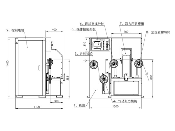 2.2、四方压延机2:采用4轮电动可调方形尺寸的结构设计,在触摸屏上设定扁线宽度和厚度参数后,伺服自动调整四方压延机的规格尺寸,压轮的0位具有预防压坏功能;定形四方压延机压轮为120钢轮;膜包方线的成品宽度和后厚度的公差尺寸可以实现数字设定后一键微调整处理,非常方便操作员对压方成品的尺寸设定和调整。四方压延机的四个压轮均有同步的动力驱动、确保膜包线的4面在挤压变形时的摩擦力很小、极好地保护包膜的表面质量。