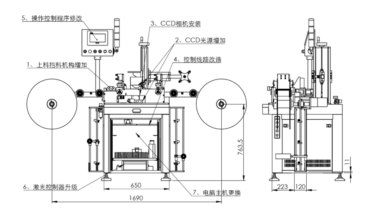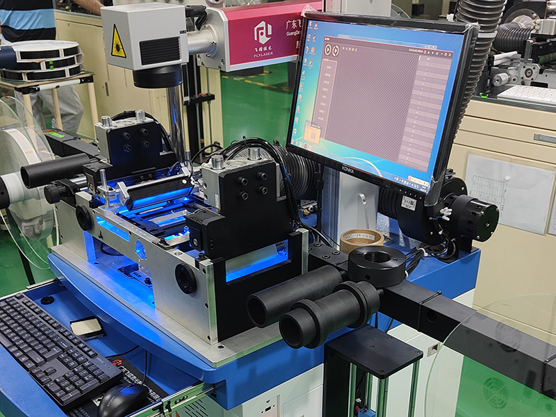 2.4、生产工艺说明:FFC产品整卷安装在放料轴盘上,进线部设有调整线宽机构;调整感应器到线口下方正中位置;设定线身到线口尺寸、生产数量、CCD特征模板设定、激光镭射内容图案及功率参数调试效果验证OK;开机自动运行时产品送料到CCD上方、CCD测量制定特征的坐标偏差、并把数值传给激光机进行XY位置修正并激光镭射加工;激光完成单个产品加工后继续下一个产品的加工;成品收卷到收料轴盘中自动收卷。
